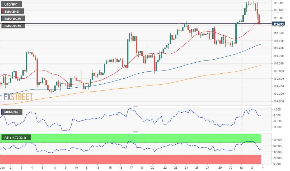 USD/JPY: Tento měnový pár na denním grafu nenaznačuje další pokles, protože cena zůstala nad všemi rostoucími klouzavými průměry, SMA 20 je dynamickým supportem kolem 110,35. Technické indikátory míří dolů v pozitivní zóně. Na 4hodinovém grafu se technické indikátory blíží k neutrální linii. Cena prolamuje rostoucí SMA 20 a k pokračování poklesu by mohlo dojít po případném prolomení pod support 110,80.