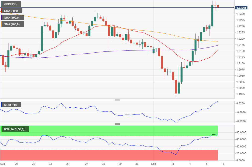 GBP/USD: Tento měnový pár se na 4hodinovém grafu obchoduje kolem 1,2310 – 1,2320. Cena je nad všemi klouzavými průměry stále výš a výš. Klouzavý průměr SMA 20 stoupá prudce, ale je stále pod SMA 100 a SMA 200. Technické indikátory ztratily sílu a jsou již v překoupené oblasti. Cena by mohla korigovat k oblasti kolem 1,2255.