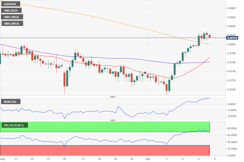 AUD/USD: Tento měnový pár na 4hodinovém grafu nezvládl prorazit nad rezistenci 0,6820. Krátkodobé očekávání je býčí, protože cena prorazila nad klouzavý průměr SMA 200. Klouzavý průměr SMA 20 míří vzhůru a je nad SMA 100, oba jsou ale zatím pod SMA 200. Technické indikátory klesly ze svých maxim, ale jsou v překoupené oblasti. Případné proražení pod support 0,6770 by mohlo vyvolat další pokles.