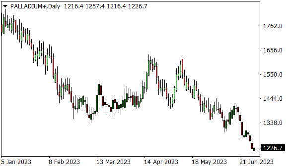 Vývoj ceny palladia (denní graf – D1):