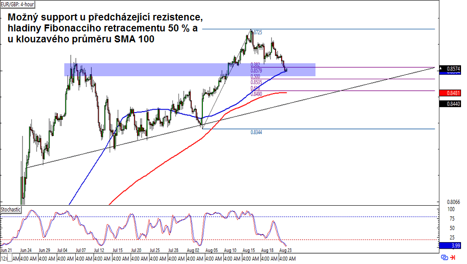 EUR/GBP: Tento měnový pár má na 4hodinovém grafu potíže s prolomením pod 0,8575, což je u hladiny Fibonacciho retracementu 50 % a u klouzavého průměru SMA 100. Tato oblast též koresponduje se zónou předcházející rezistence. Dojde nyní k odrazu vzhůru od této oblasti nebo bude pokračovat pokles až k supportu na rostoucí trendové čáře? Jestli věříte v růst na nová maxima, tak long pozice na současné úrovni se zdá být jako dobré obchodní nastavení. Můžete si ovšem též počkat na pokles k rostoucí trendové čáře.