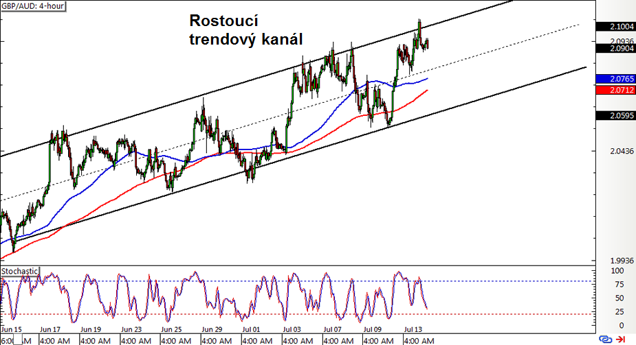 GBP/AUD: Na 4hodinovém grafu se měnový pár GBP/AUD obchoduje uvnitř rostoucího trendového kanálu. Momentálně testuje jeho horní linii poblíž významné psychologické rezistence 2,1000. Protože Stochastic signalizuje narůstající prodejní tlak, mohl by se GBP/AUD před dlouhodobějším růstem ještě vrátit až ke spodní linii kanálu, kde je v pásmu 2,0650 – 2,0700 support. Rychlý výprodej by se také mohl zastavit na střední linii kanálu, která je u SMA 100. To, že by celkový rostoucí trend mohl pokračovat, potvrzuje i skutečnost, že SMA 100 je stále nad SMA 200.