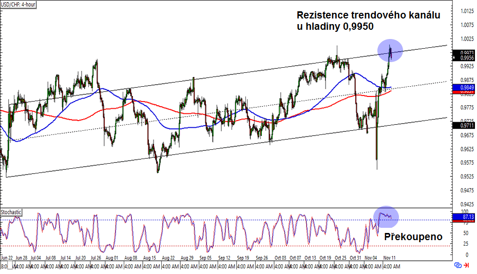 USD/CHF: Tento měnový pár se na 4hodinovém grafu pohybuje kolem hladiny 0,9950, což koresponduje s rezistencí rostoucího trendového kanálu. Stochastic je již v překoupené zóně. Dojde nyní k poklesu nebo k proražení vzhůru? Jestli věříte v pokles k supportu tohoto kanálu, tak short pozice na současné úrovni se zdá být jako dobré obchodní nastavení. Jen si dejte pozor na obchodování proti trendu.