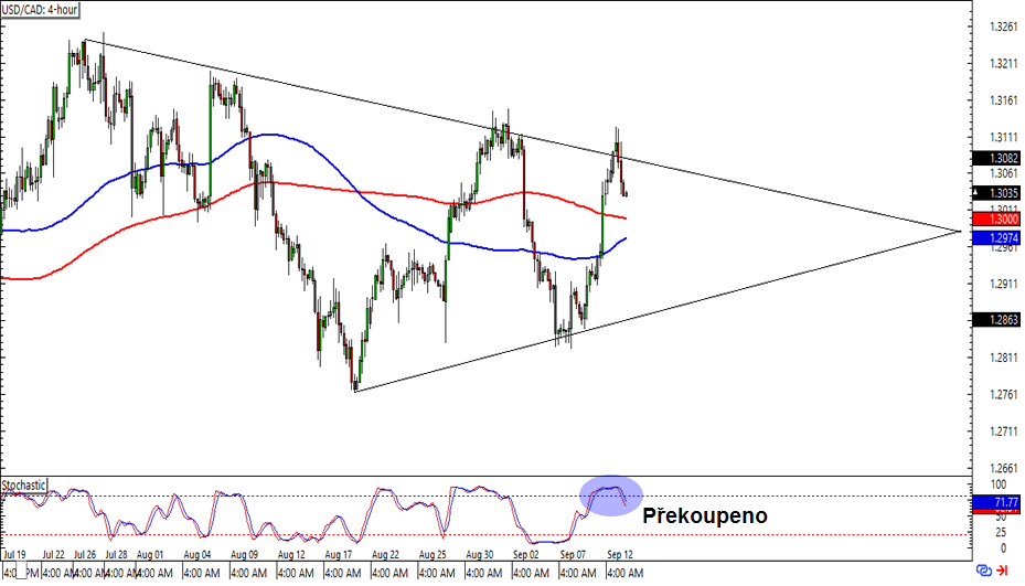 USD/CAD: Tento měnový pár se na 4hodinovém grafu odrazil od důležité psychologické hladiny 1,3100, která koresponduje s úrovní rezistence a s klesající trendovou čarou symetrického trojúhelníku. Dojde nyní k poklesu? Stochastic se chystá opustit překoupenou zónu, takže stále je prostor pro případný vstup do short pozice, jestli věříte v pokles k supportu trojúhelníku. Dejte si ovšem pozor na oblast klouzavých průměrů, kde by mohli opět kupci získat převahu a prorazit vzhůru nad tento trojúhelník.