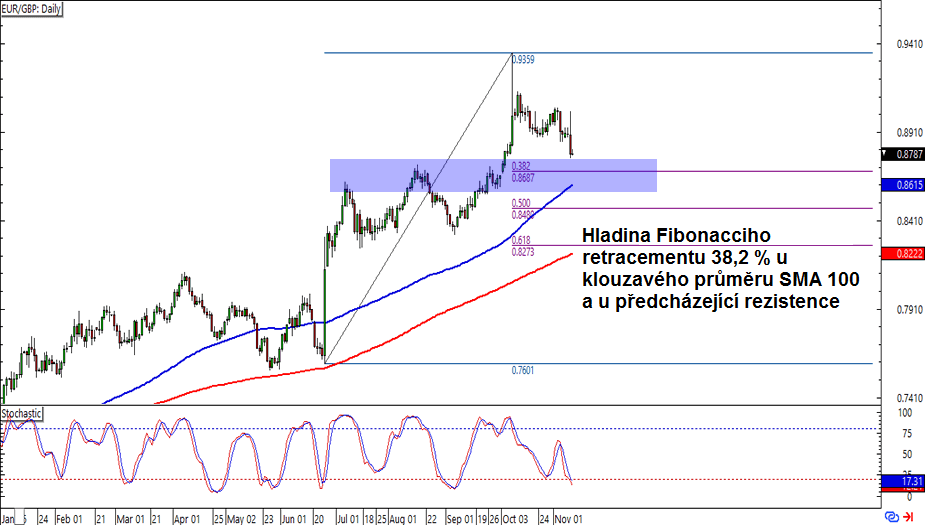 EUR/GBP: Měnový pár EUR/GBP se na denním grafu po nedávném vystřelení až téměř k 0,9400 chystá zřejmě otestovat důležitou psychologickou hladinu 0,8600, která koresponduje s hladinou Fibonacciho retracementu 38,2 % a s předcházející rezistencí. Dojde zde k odrazu a k dalšímu růstu? Jestli věříte v růst, tak long pozice po vytvoření býčích svíček kolem hladiny Fibonacciho retracementu 38,2 % se zdá být jako dobré obchodní nastavení. Ovšem v případě prolomení směrem dolů bychom se mohli dočkat poklesu až k hladině 0,8400.