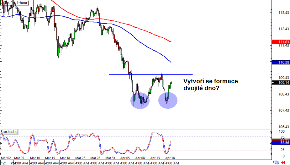 USD/JPY: Tento měnový pár se na 1hodinovém grafu již několikrát odrazil od důležité psychologické hladiny 108,00 a zdá se, že vytváří formaci dvojité dno. Mohli bychom být svědky obratu trendu. Případný růst po proražení linie neckline formace dvojité dno by mohl být stejně velký, jako výška této formace, tedy asi 150 pipů. Dojde k dalšímu růstu amerického dolaru?