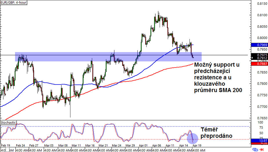 EUR/GBP: Tento měnový pár má na 4hodinovém grafu potíže s prolomením důležité psychologické hladiny 0,7900, protože se jedná o důležitou S/R oblast. Je totiž blízko klouzavého průměru SMA 200 a Stochastic je již téměř v přeprodané zóně. Kupci si mohou počkat na několik býčích svíček před vstupem do pozice, zatímco prodejci si mohou vyčkat na prolomení supportu dolů.