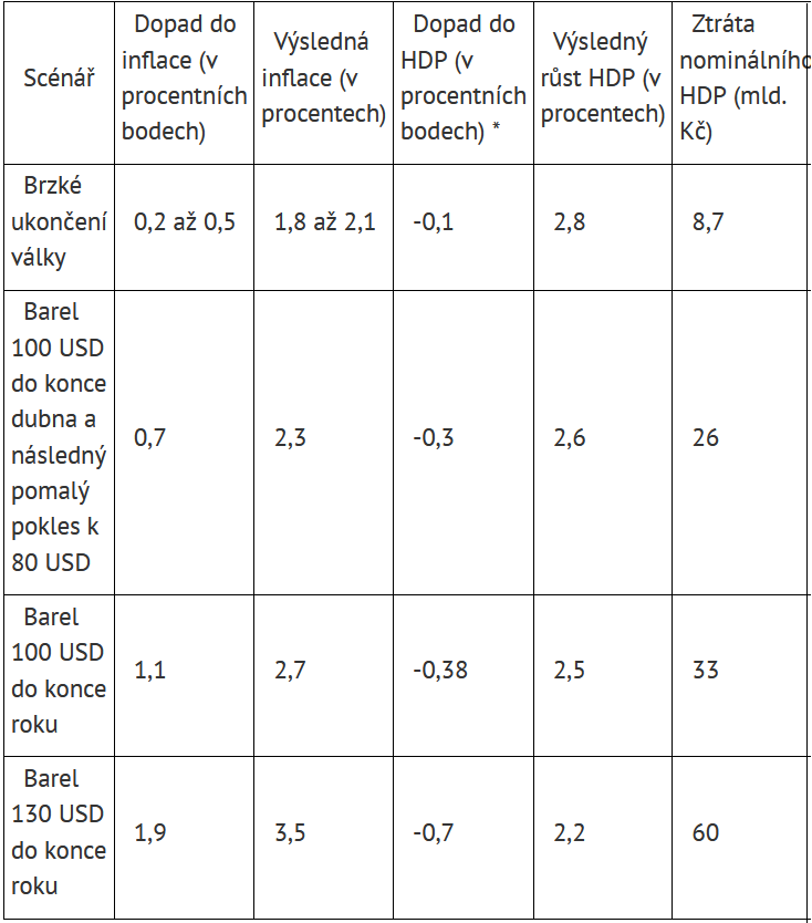 *Model kalkuluje jen se změnou ceny ropy. Při ceně ropy na 130 dolarech za barel by ale dramaticky rostlo riziko globální recese a dopady do růstu tuzemské malé otevřené ekonomiky, která je závislá na zahraniční poptávce, by tak mohly být obratem závažnější.