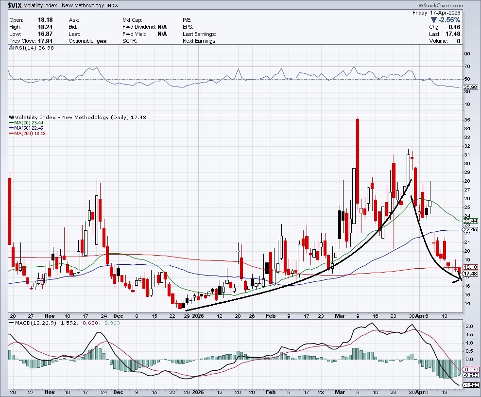 Index volatility VIX (takzvaný index strachu, který měří rozkolísanost trhu) pokračoval v poklesu, za týden se snížil o dalších 9,10 %. Je pod klouzavými průměry a jeho nedávné vysoké úrovně nad 30 body byly potvrzeny jako (další) nákupní signál pro akcie.