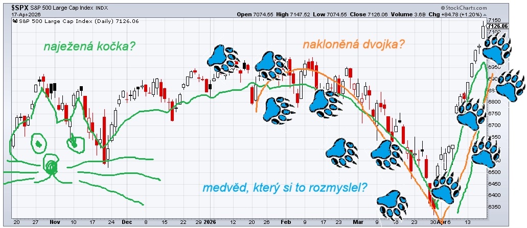 Americký akciový trh předvedl extrémně rychlý obrat a index S&P 500 po poklesu o skoro 10 % prudce zpevnil o zhruba 13 %. V týdnu jsme k tomu vydali anketu, která s trochou nadsázky hledala a stále hledá případný vhodný název pro poměrně netypický "vzorec" oživení cen akcií. Vedle možností uvedených v anketě samotné se nabízejí i mnohé další, z nichž některé najdete přímo v grafu. A klidně si zahlasujte.