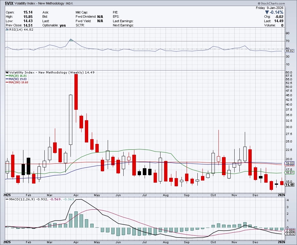 Vývoj indexu volatility VIX (týdenní graf – W1):