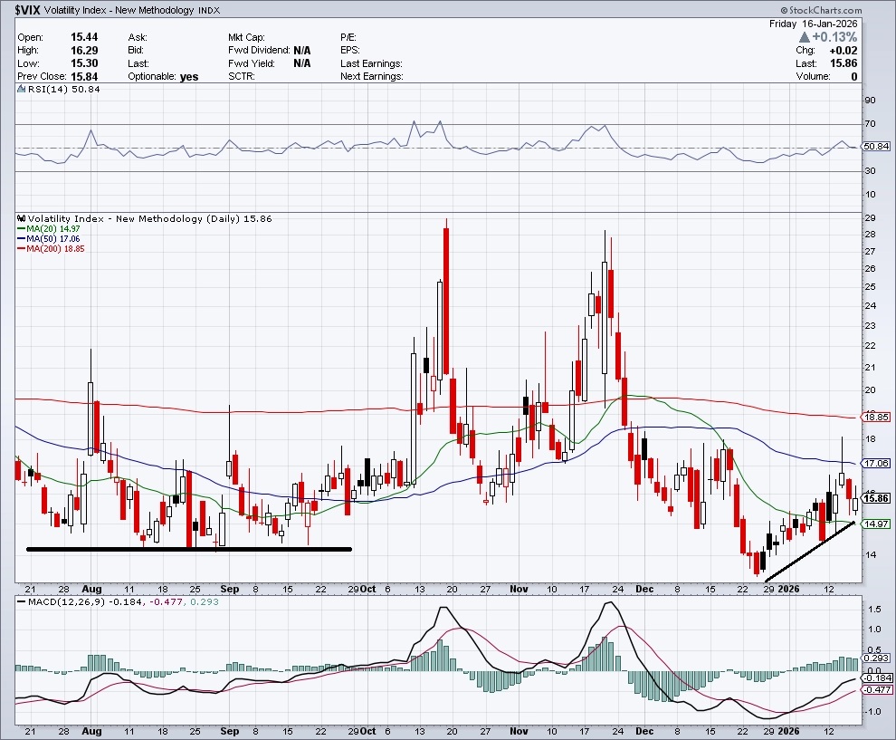 Index volatility VIX (takzvaný index strachu, který měří rozkolísanost trhu) nepředvádí nic divokého a během mírných poklesů akciového trhu odpovídajícím způsobem lehce roste. Za týden přidal 9,45 %, posouvá se ale z velice nízkých úrovní. Od Vánoc je ale patrná mírná tendence k růstu volatility, na historickém maximu akciového trhu to ale není překvapení, tendence obchodníků se zajišťovat už byla zmíněna. Varovný by v případě VIX byl až vzestup nad jeho 200denní průměr.