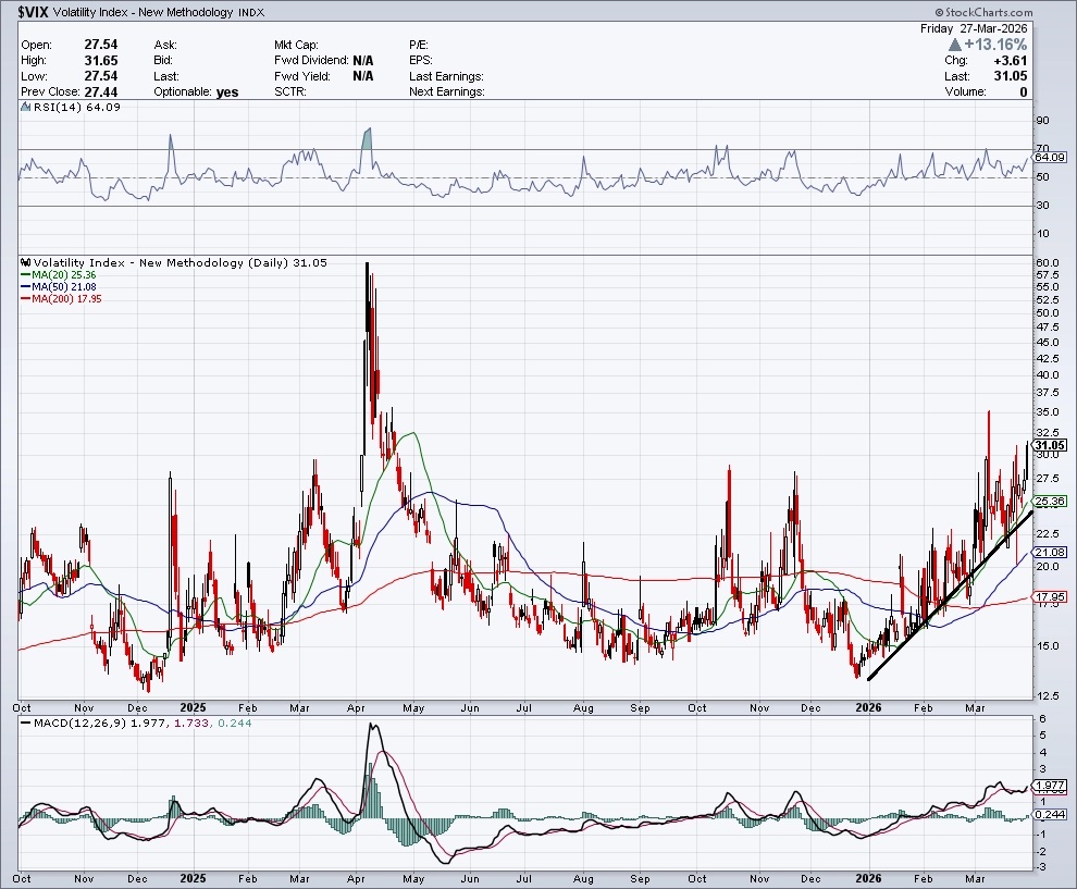 Poměr put a call opcí stále roste, což je pro trh negativní signál. Dokud nezačne klesat, nelze čekat ani nákupní signál ani na grafu už výrazně zvýšeného indexu volatility VIX (takzvaný index strachu, který měří rozkolísanost trhu). Ten za týden vzrostl o 15,94 %, je nad 30 a po celý letošní rok je v růstovém trendu. Zlepšení nálady na akciovém trhu by indikoval pokles "indexu strachu" pod jeho 20denní klouzavý průměr.