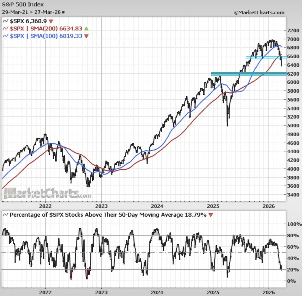 Celková nálada na americkém akciovém trhu je negativní. Případný odraz indexu S&P 500 výše z přeprodaných podmínek může brzy narazit na poměrně silnou rezistenci okolo 6 500. Ke klouzavým průměrům má benchmark daleko. Už hodně výrazná většina titulů je přitom pod svým 50denním průměrem.