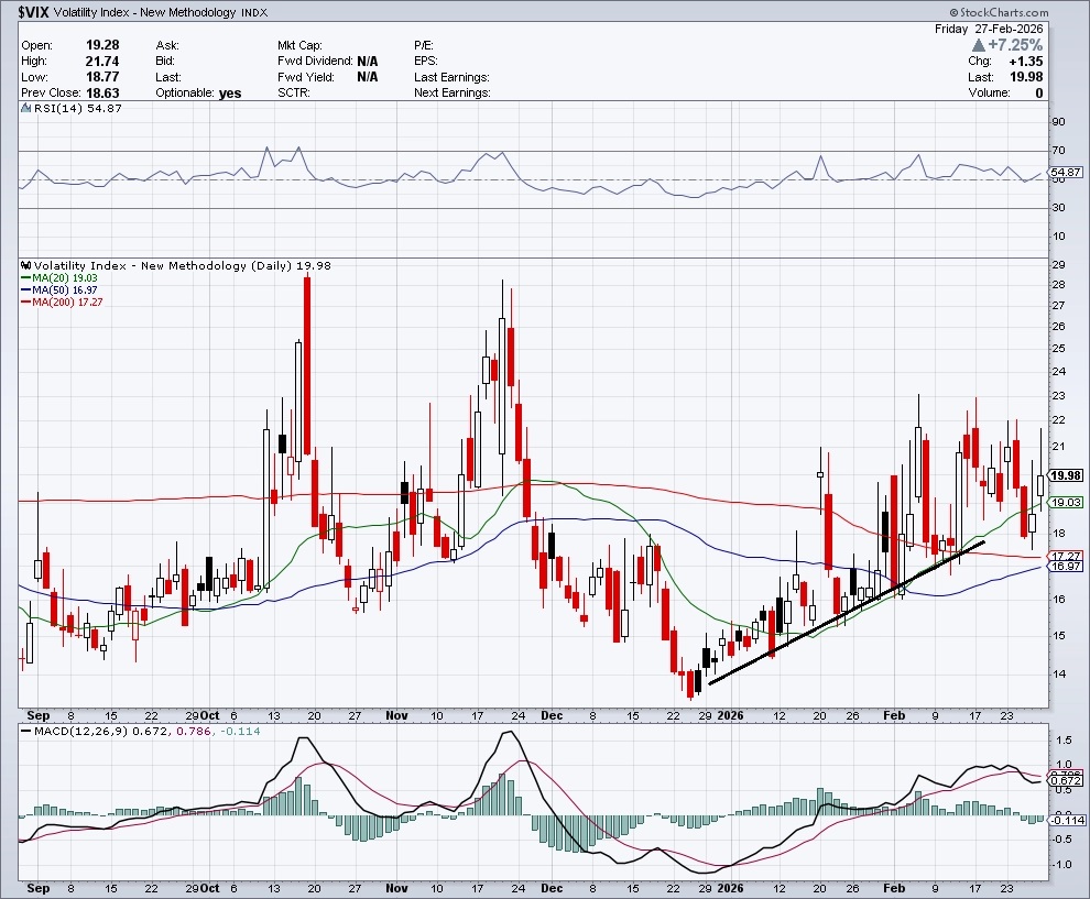 Index volatility VIX (takzvaný index strachu, který měří rozkolísanost trhu) za týden stoupl o 4,03 %. Drží se okolo 20 bodů a zatím zůstává v platnosti nákupní signál pro akcie ze 6. února, zároveň ale už dva měsíce průběžně roste a signalizuje narůstající nejistotu ohledně nejbližšího vývoje na akciovém trhu.