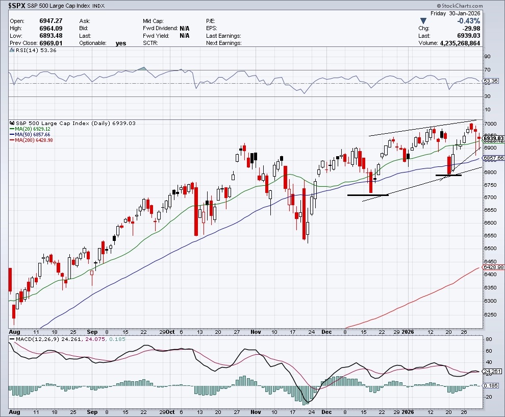 Už zhruba dva měsíce se index drží v úzkém pásmu 6 700 až 7 000, pullbacky byly v tomto období jen mírné. Prudší sesun nastal pouze v polovině ledna kvůli nervozitě okolo Grónska a hrozbě nových cel, i tento pokles byl ale rychle smazán a vepsal do denního grafu hladinu podpory okolo 6 800. Další, silnější support je na prosincovém minimu okolo 6 720 bodů. Až sestup pod tuto úroveň by dostal do hry medvědí scénář.