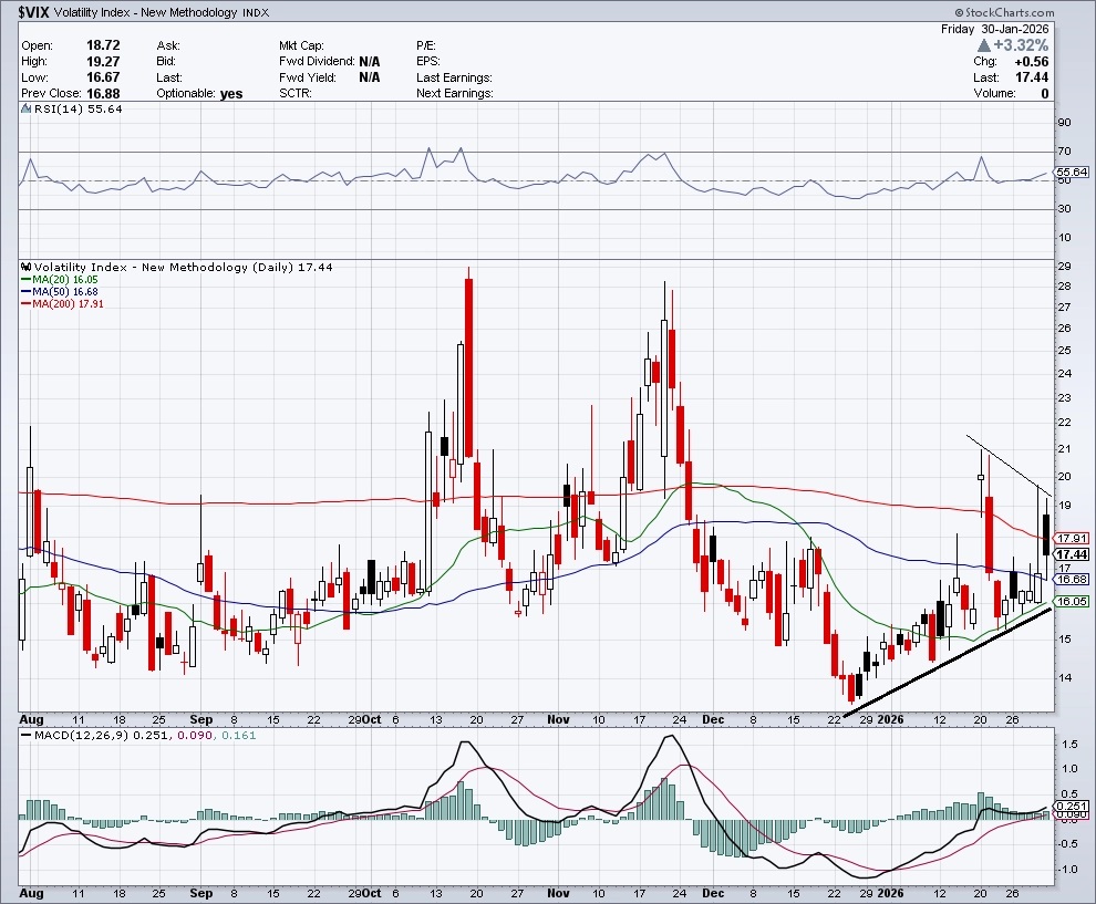 Index volatility VIX (takzvaný index strachu, který měří rozkolísanost trhu) stoupl za týden o 8,39 %. Není vysoko, postupně ale roste už několik týdnů a naznačuje, že akciový trh není "bez nervů". Nákupní signál, který se na úrovni volatility spustil právě v době, kdy hrozila nová cla kvůli Grónsku, je stále platný.