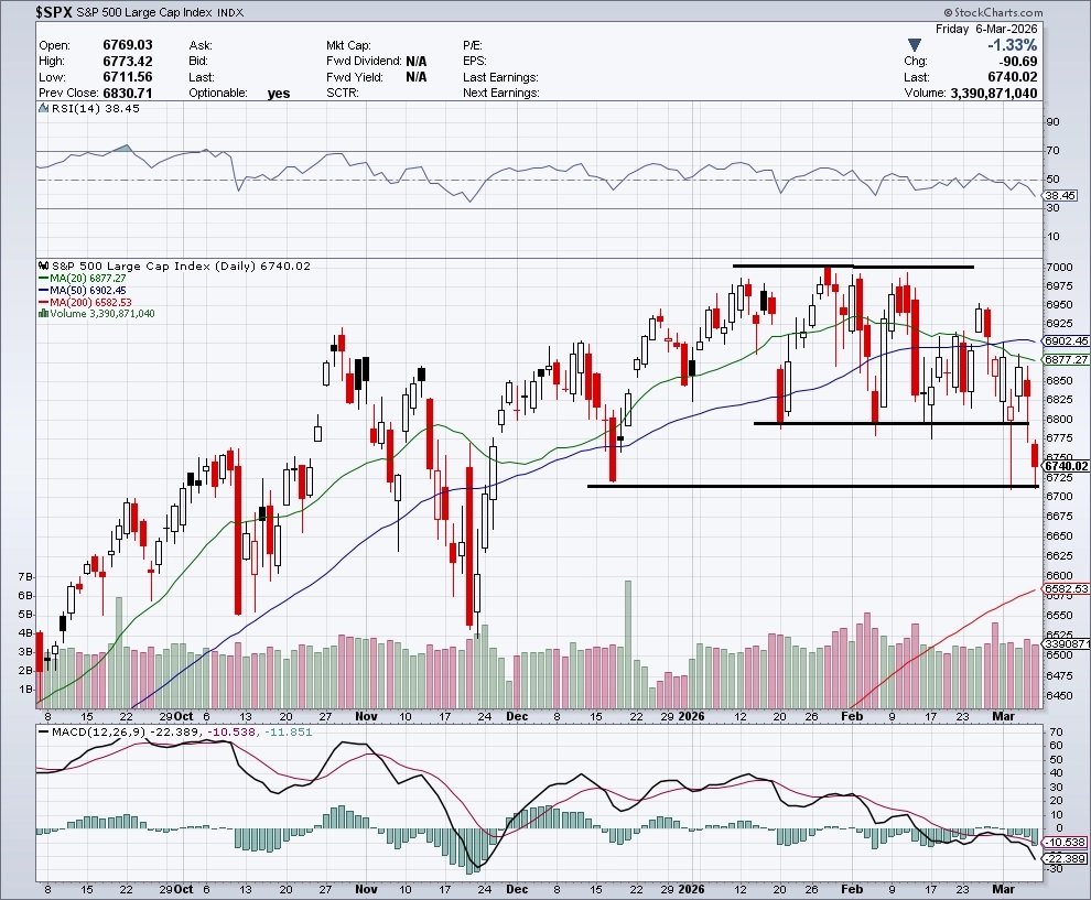 Akciový index S&P 500 v týdnu několikrát testoval pásmo 6 700 až 6 720 bodů. To je v současnosti nejbližší úrovní podpory, trh se od ní několikrát odrazil výše. Na trhu byla patrná aktivita swingových traderů, kteří nakupovali nad 6 700 a prodávali okolo 6 900. Spodní hrana tohoto rozpětí je důležitou úrovní podpory, kde byla minima loni v prosinci. Níže by pak byl ve hře zásadní support okolo 6 500, pod kterým by i střednědobou vládu nad trhem jasně převzali prodejci.