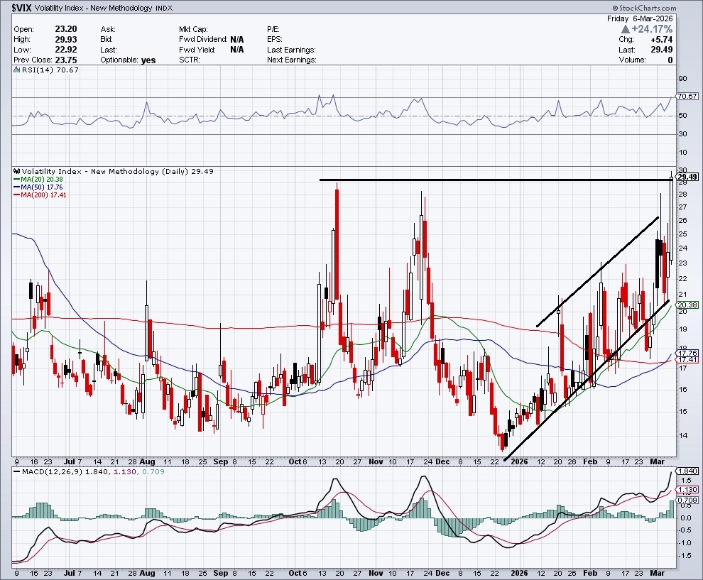 Index volatility VIX (takzvaný index strachu, který měří rozkolísanost trhu) za týden vystřelil v týdnu o výrazných 48,49 % a posunul se tak intradenně skoro na 30 bodů. V uplynulém půlroce se takto vysoké úrovně ukázaly být nákupním signuálem pro akcie. V současnosti je ale situace kvůli geopolitickému riziku hodně nepřehledná a nejistá a obchodníci se zajišťují proti dalším propadům.¨