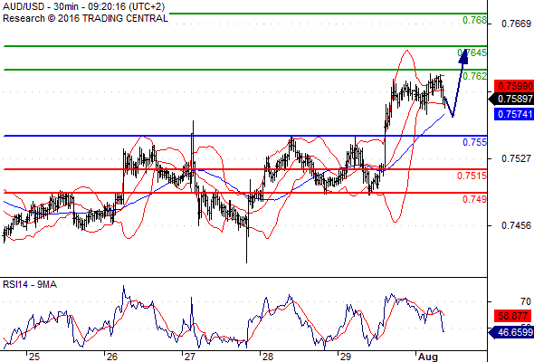 Preferovaný scénář: Dlouhé (long) pozice nad 0,7550 s cílem na 0,7620 a dále pak až na 0,7645.