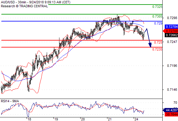 Preferovaný scénář: Krátké (short) pozice pod 0,7290 s cílem na 0,7250 a dále pak až na 0,7235.