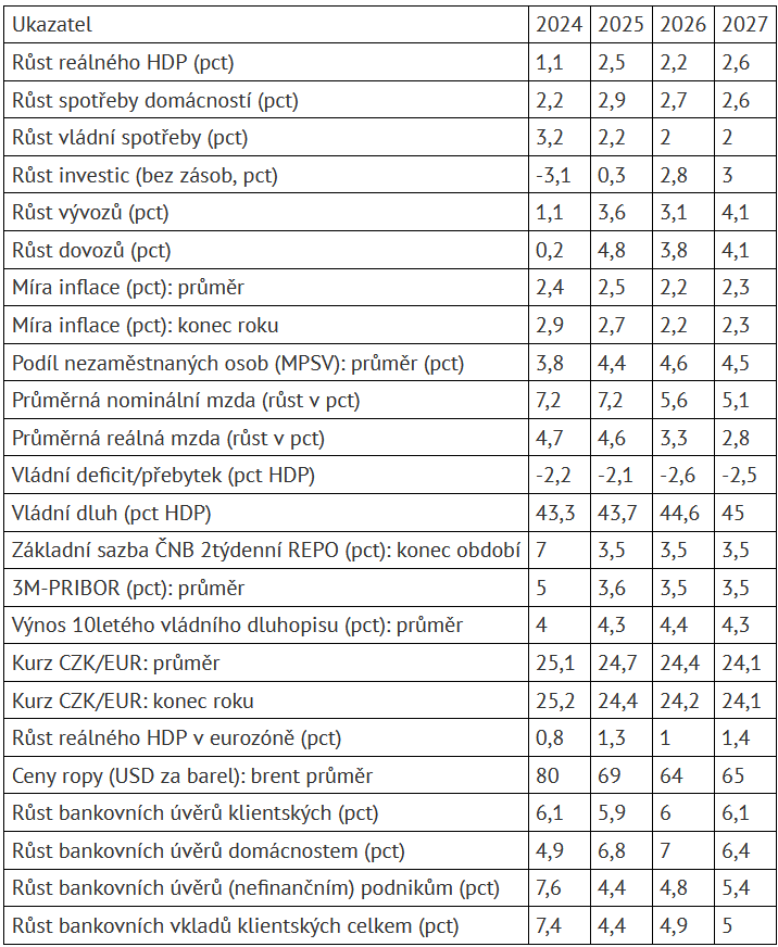 Asociace zlepšila i výhled pro příští rok, když čeká růst HDP 2,2 procenta, zatímco v srpnu čekala dvě procenta. V roce 2027 by měl český ekonomický výkon dál zesílit na 2,6 procenta. Inflace podle prognózy příští rok zvolní na 2,2 procenta, v roce 2027 se opět mírně zvýší na 2,3 procenta. Základní úroková sazba České národní banky (ČNB) podle prognózy zůstane i příští dva roky na současné úrovni 3,5 procenta.