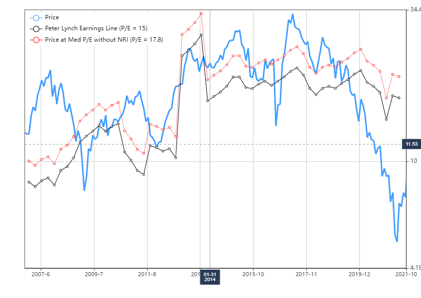 Target price väčšiny analytikov je na úrovni 12.75 dolára. Ďalší indikátor toho že akcie sú podhodnotené je nasledujúca metóda Petra Lyncha kde je vypočítaná cena akcie pri P/E 15 aktuálne P/E je 7 tu vidíme že férová cena podľa earnings je okolo 15 dolárov...