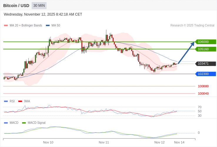 Preferovaný scénář: Dlouhé (long) pozice nad 102 300 s cílem na 105 160 a dále pak až na 106 000.