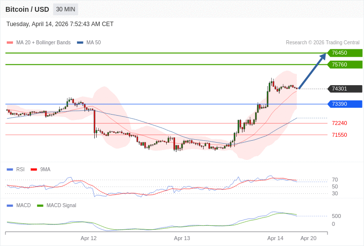 Preferovaný scénář: Dlouhé (long) pozice nad 73 390 s cílem na 75 760 a dále pak až na 76 450.