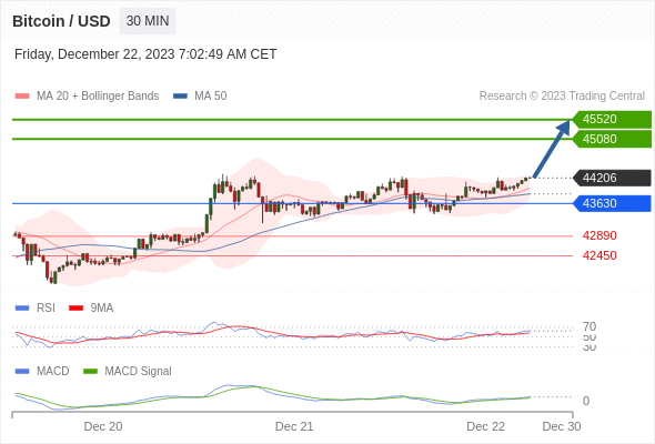 Preferovaný scénář: Dlouhé (long) pozice nad 43 630 s cílem na 45 080 a dále pak až na 45 520.
