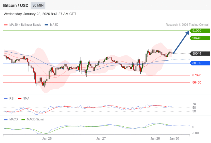 Preferovaný scénář: Dlouhé (long) pozice nad 88 180 s cílem na 90 440 a dále pak až na 91 090.