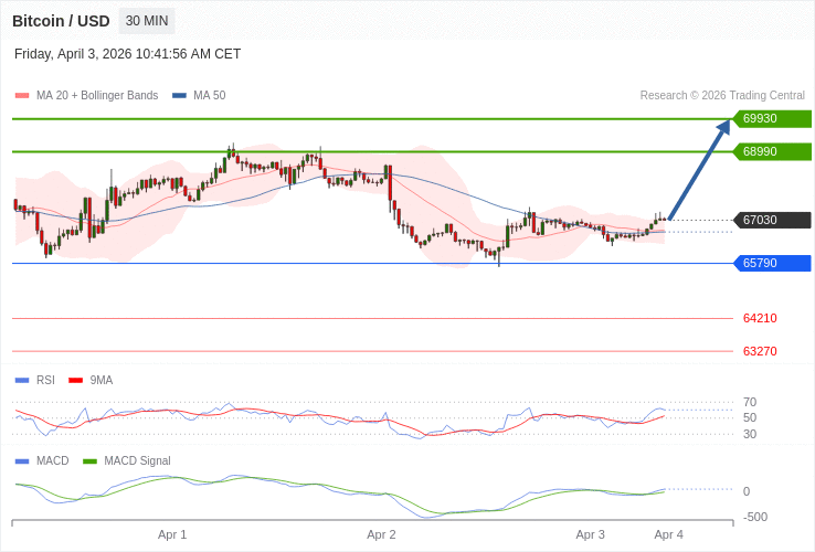 Preferovaný scénář: Dlouhé (long) pozice nad 65 790 s cílem na 68 990 a dále pak až na 69 930.