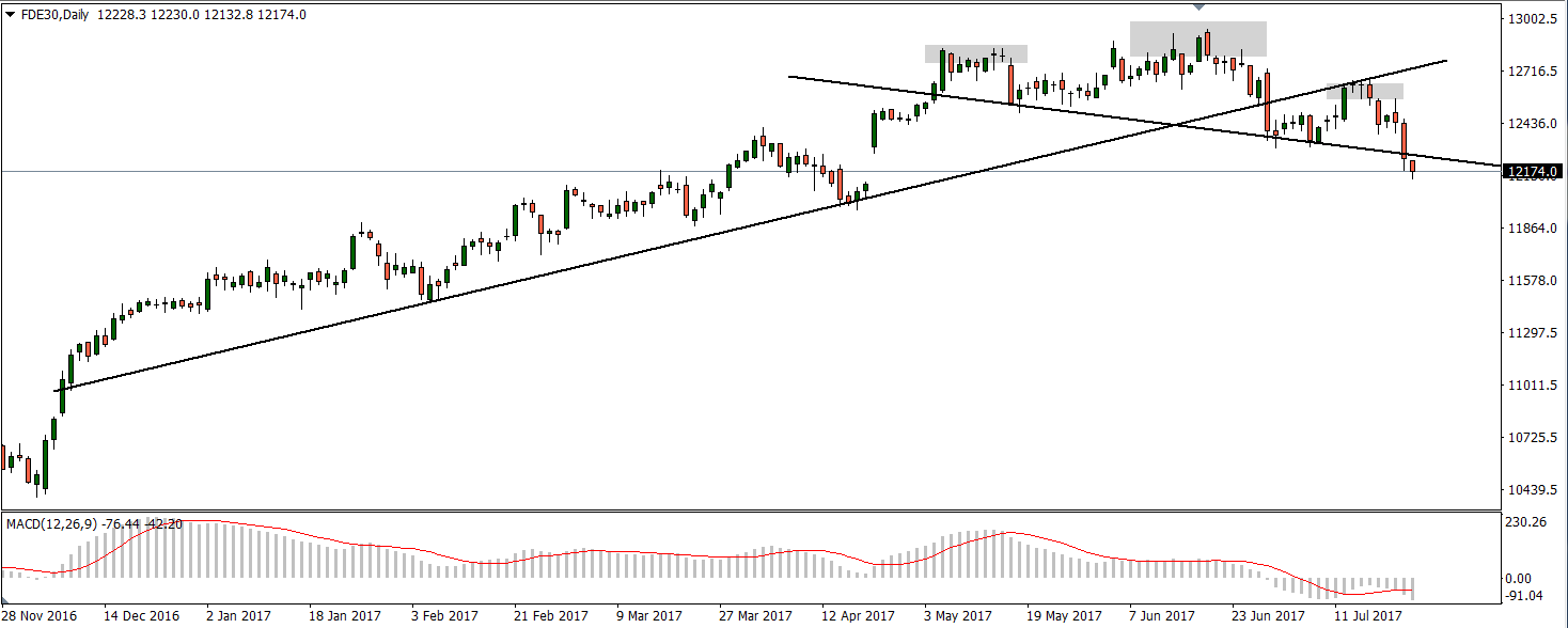 Německý akciový index DAX vytvořil na denním grafu reverzní formaci hlava ramena a klesl pod důležitou úroveň „neckline“. Aktuální vývoj favorizuje vyplnění formace a pokračování poklesu německého akciového indexu.