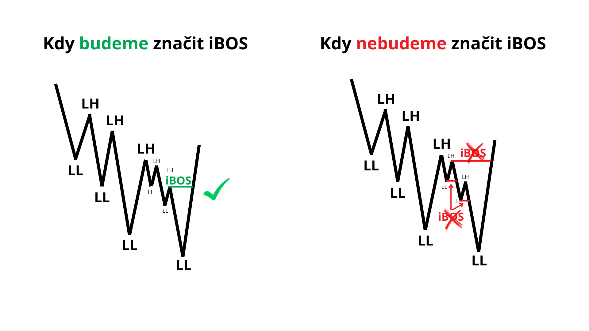 Obrázek správného a špatného značení iBOS při bearish trendu