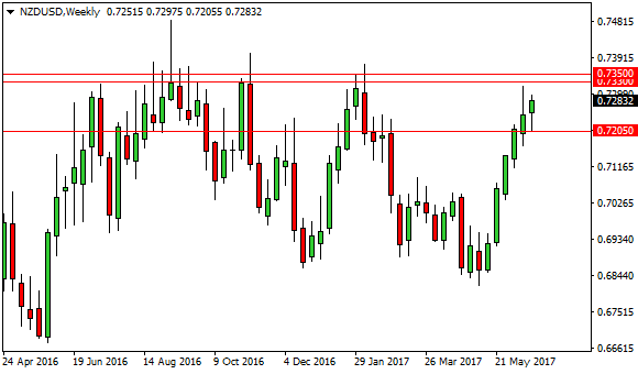 Společnost NAB (oddělení FX Technical Strategy Research) ve své analýze tvrdí, že tendence měnového páru NZD/USD zůstávají nadále býčí. Pohled na týdenní a měsíční graf značí jasnou býčí dynamiku tohoto měnového páru ze střednědobého pohledu. Pokud NZD/USD na týdenním grafu uzavře nad oblastí rezistence 0,7330 - 0,7350, tak se můžeme dočkat dalšího pokračování růstu v horizontu týdnů až měsíců. Naopak uzavření na týdenním grafu pod hladinou 0,7205 by mohlo vyvolat korekci k nižším hodnotám.