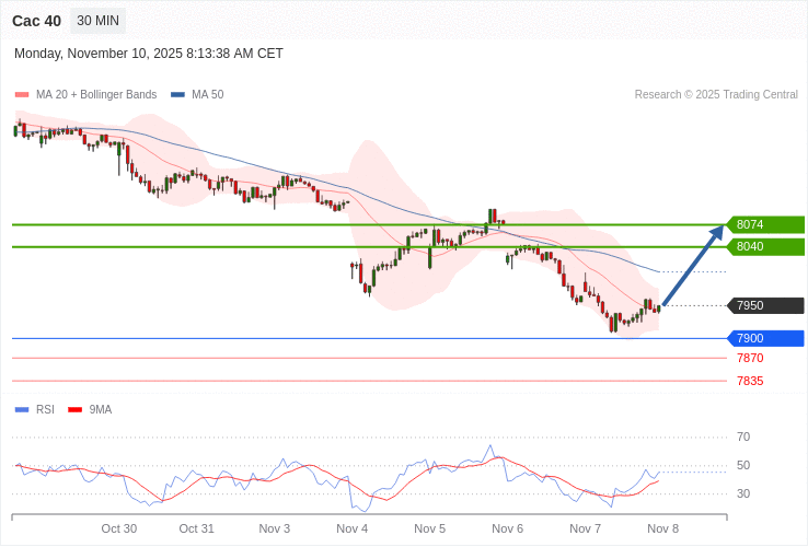Klíčová slova: Intradenní výhled | Indikátor | Long | Pozice | RSI | Rezistence | Trading | CAC 40 | Pivot | Trading Central | Supporty a rezistence | Výhled | Pokles | Indikátor RSI | Dlouhé (long) pozice | Supporty |
