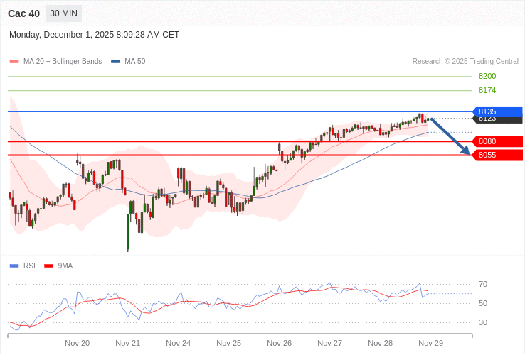 Komentář: Dokud se index CAC 40 bude obchodovat pod rezistencí 8135, tak je pravděpodobný pohyb do strany s mírnou medvědí tendencí.