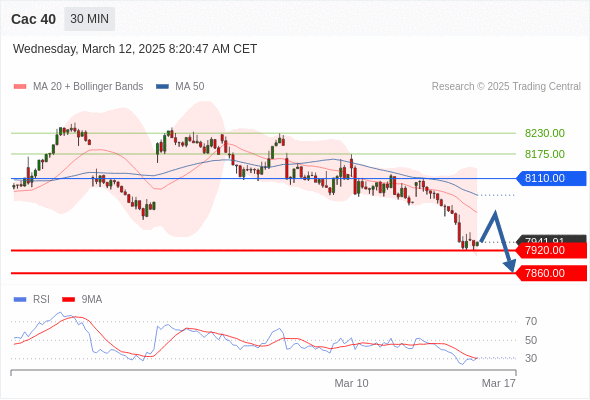 Komentář: Dokud se index CAC 40 bude obchodovat pod rezistencí 8110, tak je pravděpodobný průraz pod hladinu 7920.