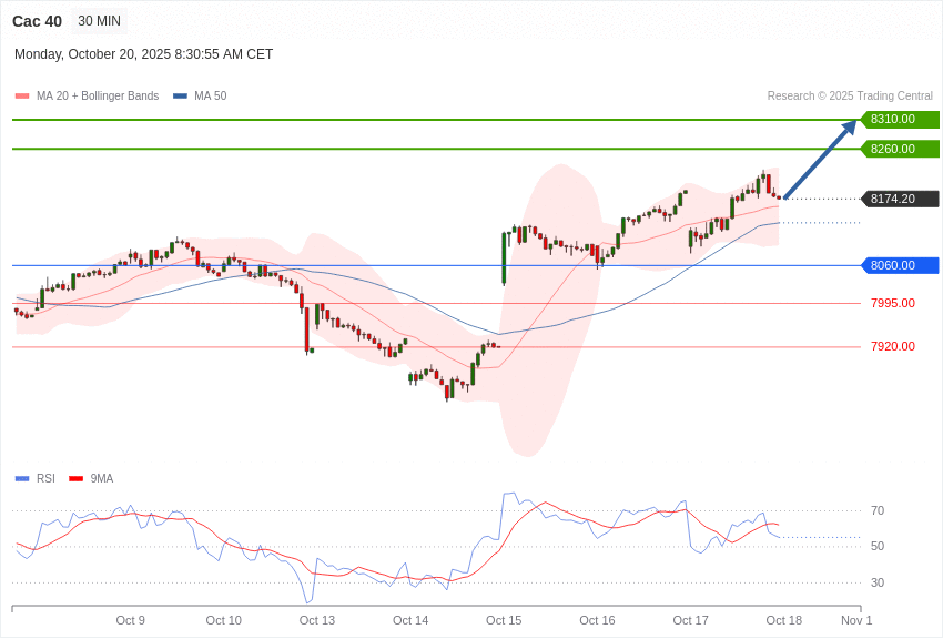Klíčová slova: Intradenní výhled | Indikátor | Long | Pozice | RSI | Rezistence | Trading | CAC 40 | Pivot | Signály | Trading Central | Supporty a rezistence | Výhled | Pokles | Indikátor RSI | Dlouhé (long) pozice | Supporty |