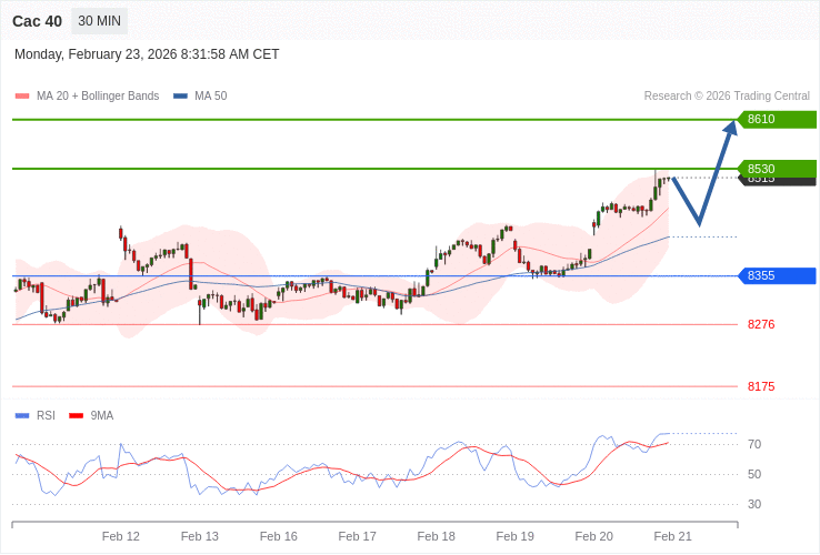 Klíčová slova: Intradenní výhled | Indikátor | Long | Pozice | RSI | Rezistence | Trading | CAC 40 | Pivot | Trading Central | Supporty a rezistence | Výhled | Pokles | Indikátor RSI | Další růst | Růst | Dlouhé (long) pozice | Supporty |