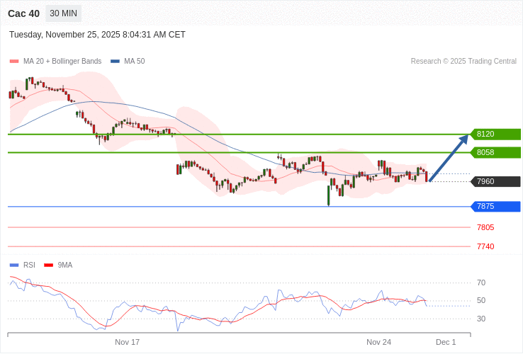 Klíčová slova: Intradenní výhled | Long | Pozice | Rezistence | Support | Trading | CAC 40 | Pivot | Trading Central | Supporty a rezistence | Výhled | Pokles | Dlouhé (long) pozice | Supporty |