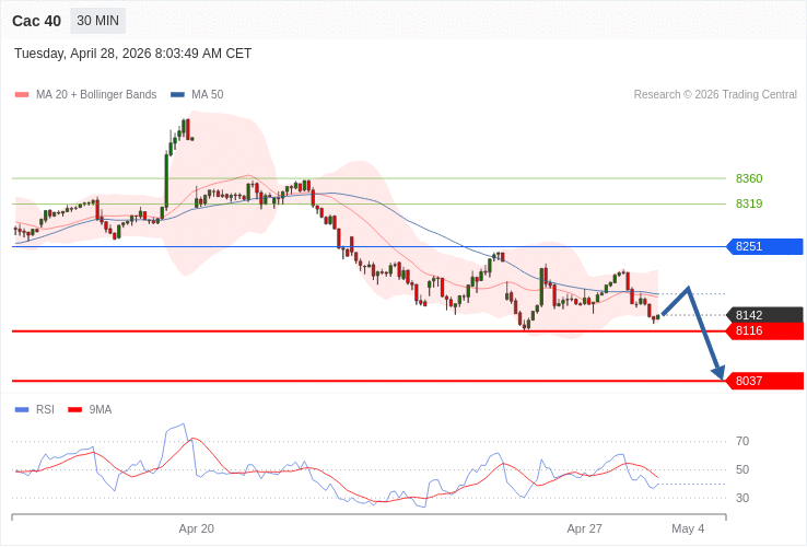 Komentář: Dokud se index CAC 40 bude obchodovat pod rezistencí 8251, tak je pravděpodobný průraz pod hladinu 8116.