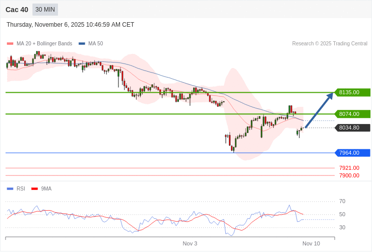 Klíčová slova: Intradenní výhled | Long | Pozice | Rezistence | Support | Trading | CAC 40 | Pivot | Trading Central | Supporty a rezistence | Výhled | Pokles | Dlouhé (long) pozice | Supporty |