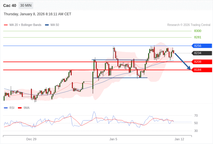 Komentář: Akciový index CAC 40 se nyní nachází poblíž rezistence 8256.