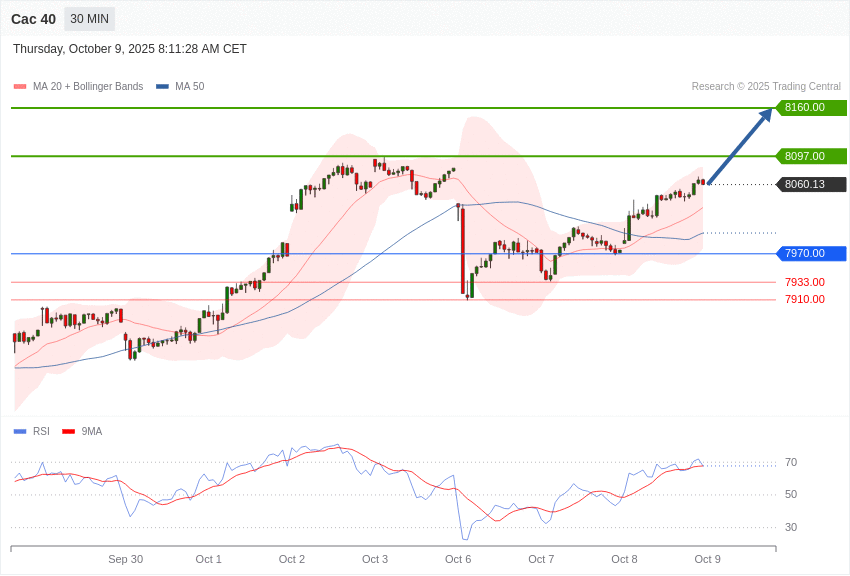 Klíčová slova: Intradenní výhled | Indikátor | Long | Pozice | RSI | Rezistence | Trading | CAC 40 | Pivot | Signály | Trading Central | Supporty a rezistence | Výhled | Pokles | Indikátor RSI | Dlouhé (long) pozice | Supporty |