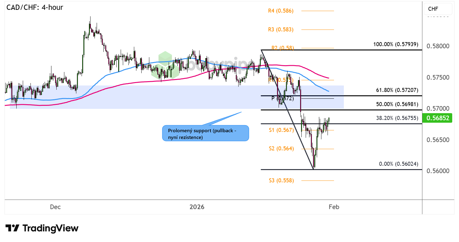 CAD/CHF testuje support v klíčové konfluenční oblasti