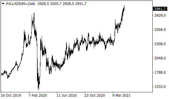 Cena palladia poprvé překročila hranici 3000 dolarů za unci