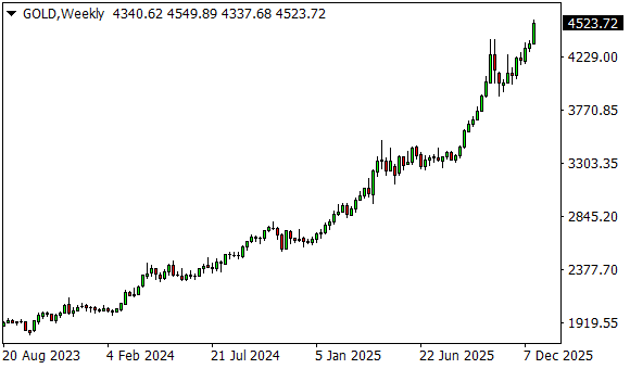 Ve středu cena zlata poprvé překročila 4500 dolarů (92.696 Kč) za unci a dnes brzy ráno se dostala na 4504,79 dolaru (92.786 Kč) za unci poté, co dříve dosáhla 4530,60 dolaru (93.318 Kč). Cena termínového kontraktu na zlato s dodáním v únoru se pohybovala mírně nad 4535 dolarů (93.408 Kč) za unci.
