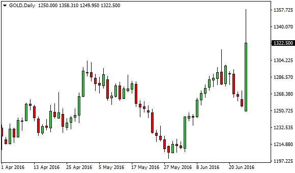 Cena zlata dnes zaznamenala největší růst od globální finanční krize v roce 2008, část zisků však dokázalo zlato umazat a momentálně posiluje zhruba o 5,15 % a obchoduje se poblíž červnového maxima z letošního roku.