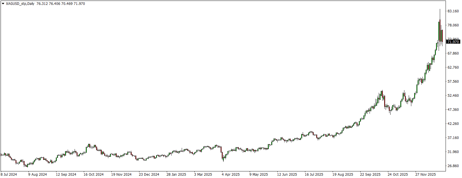 Vývoj ceny stříbra (denní graf - D1):